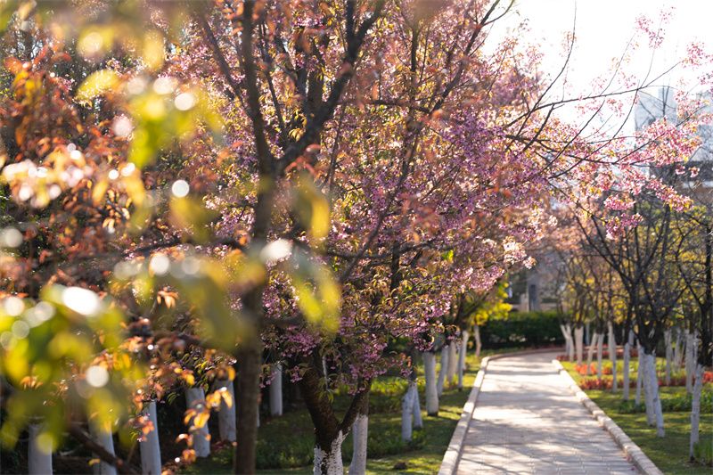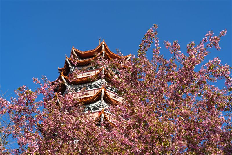 冬日暖阳下,楚雄福塔公园的冬樱花已悄然绽放,粉白相间的花瓣随风摇曳,与古朴的福塔相映成趣,构成一幅绝美的冬日画卷。