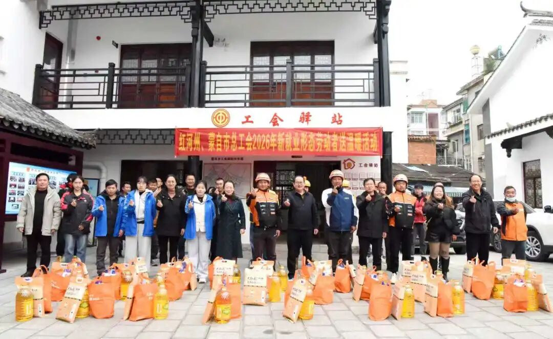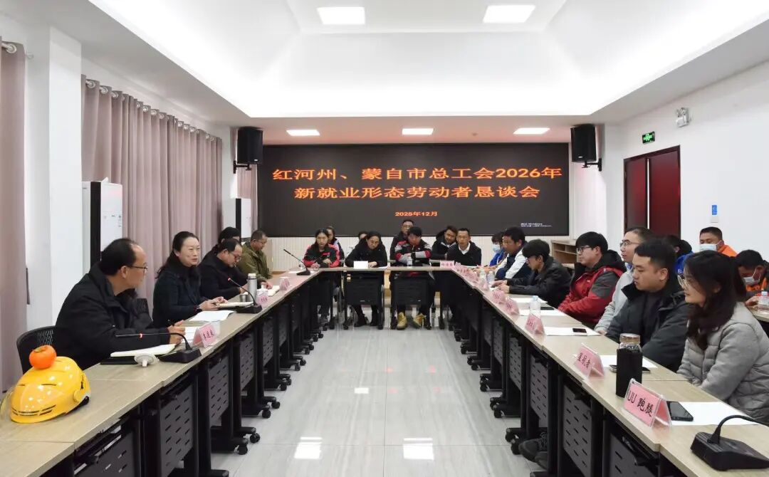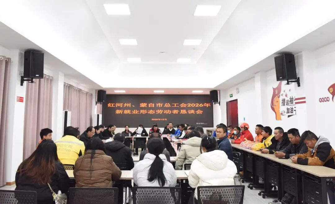 为扎实推进“进万家门、访万家情、结万家亲、送万家暖”活动,把对新就业形态劳动者的关爱落到实处,12月25日,红河州、蒙自市总工会2026年新就业形态劳动者恳谈会在蒙自市总工会温情召开。活动以“送温暖”为核心,近距离倾听劳动者心声,实打实解决急难愁盼,为新就业形态劳动者架起与工会组织的“连心桥”。