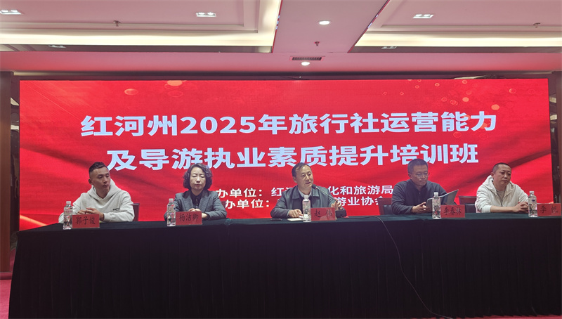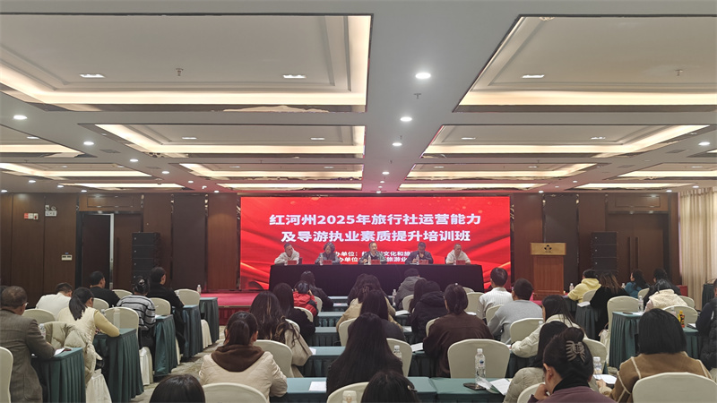 12月28日,红河州2025年旅行社运营能力及导游执业素质提升班开班仪式在蒙自举行,来自全州的相关旅行社负责人、导游及景区讲解员共100余人参加了此次培训。红河州文化和旅游局党组书记、局长赵伟出席了开班仪式并作动员讲话。