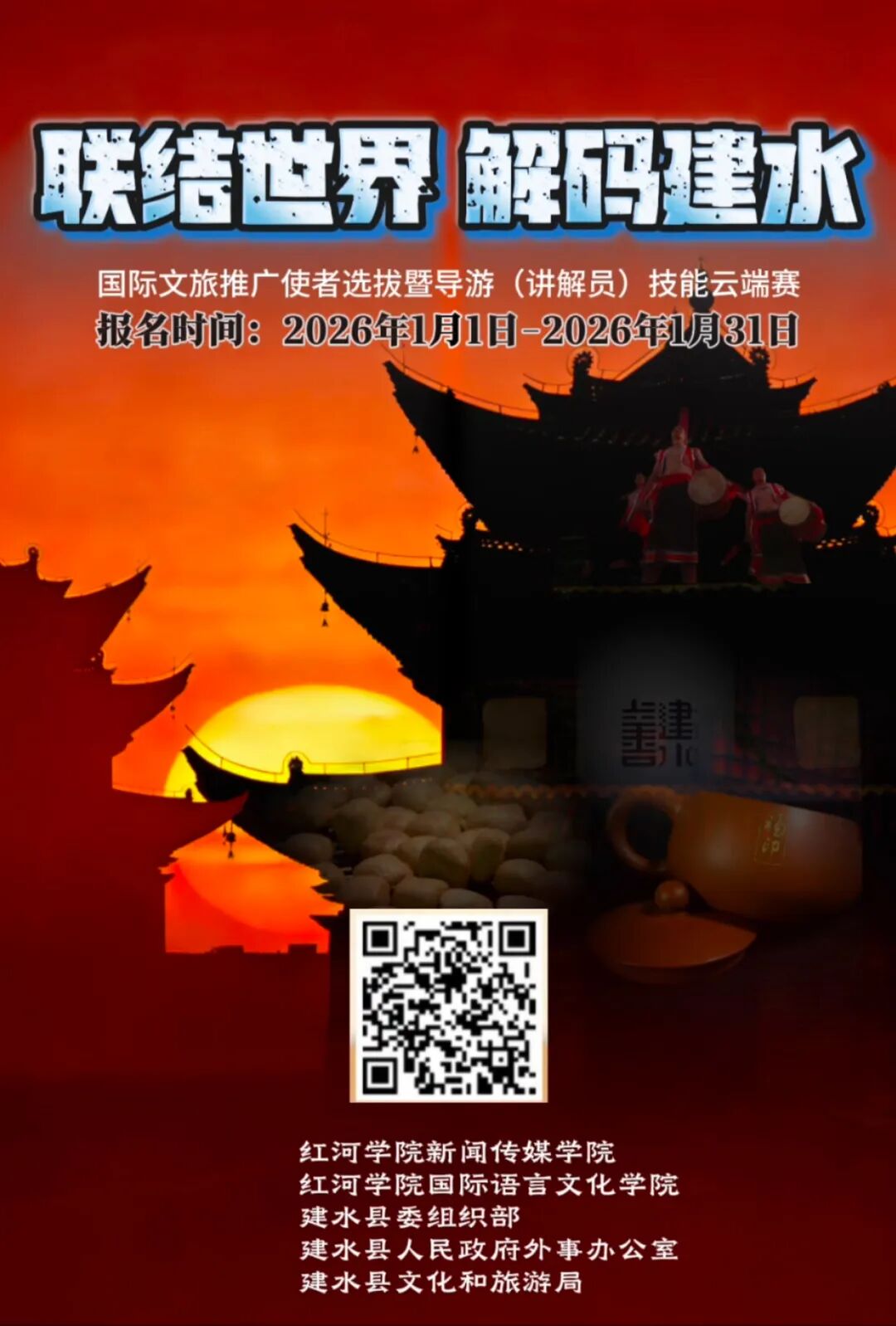 为扎实推进“一家人的建水”文旅品牌建设,助力打造“滇南最美乡愁之旅”,不断提升建水文旅人才队伍建设水平,提高广大从业人员的国际传播能力,高质量推动全县旅游行业持续健康发展,特举办建水县“联结世界 解码建水”国际文旅推广使者选拔暨导游(讲解员)技能云端赛。