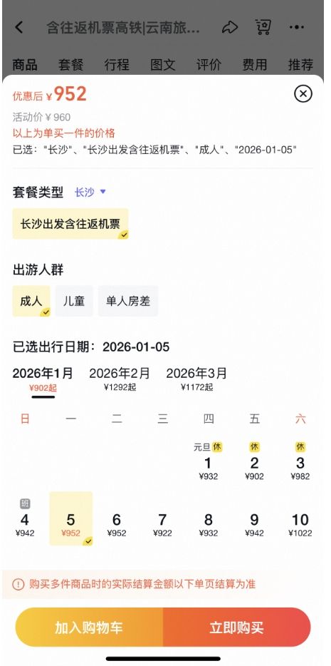 从行程看,2026年1月5日长沙至昆明出发时查询的往返机票价格最低为460元。