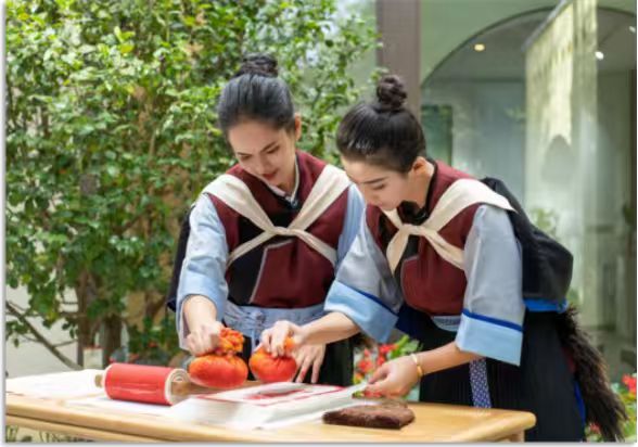 东巴书院的文化体验远不止于此。从采用古法荛花树皮制作东巴纸,到学习纳西族妇女“披星戴月”服饰文化的相框制作;从在激昂鼓点中跳起质朴粗犷的勒巴舞,到夜幕降临时围聚在篝火旁共唱“阿里里”;再到品味寓意甜蜜祝福的纳西传统茶点“三叠水”……东巴书院精心设计的一系列活动,如同一幅徐徐展开的纳西生活长卷,让参与者从技艺、艺术、节庆、饮食等多个维度,全方位地融入纳西族的世界观与日常生活。