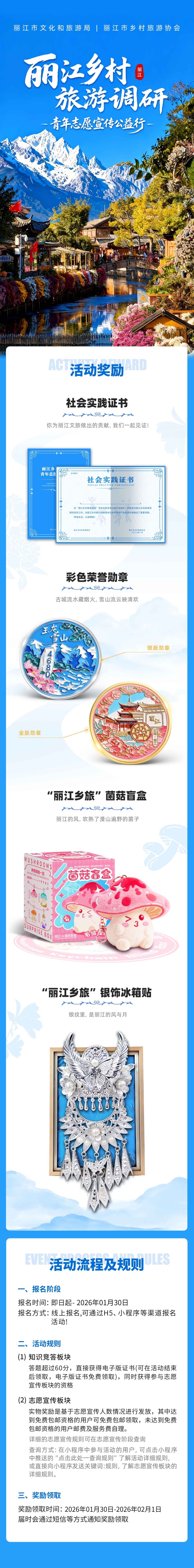 近日,由丽江市文化和旅游局指导、丽江市乡村旅游协会主办的“丽江乡村旅游调研”青年志愿宣传公益行活动启动。活动旨在通过深入乡村实地调研,助力青年一代增进对丽江乡村多元文化及乡村振兴实践的了解,提升文化素养与实践能力;在沉浸式的乡村体验中,引导青年传承中华优秀传统文化,并以青春力量赋能乡村旅游高质量发展。快来吧!期待你的参与,与我们共同探寻乡村之美,贡献青年智慧!