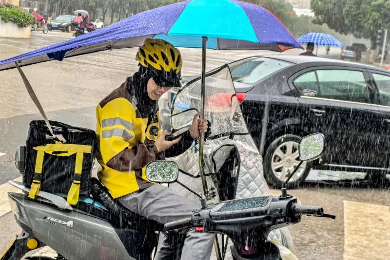 雨点敲打车身,快递员冒雨穿梭街巷,准时送达包裹与期盼。风雨里,他们是商品传递者,更是城市运转的暖心纽带。