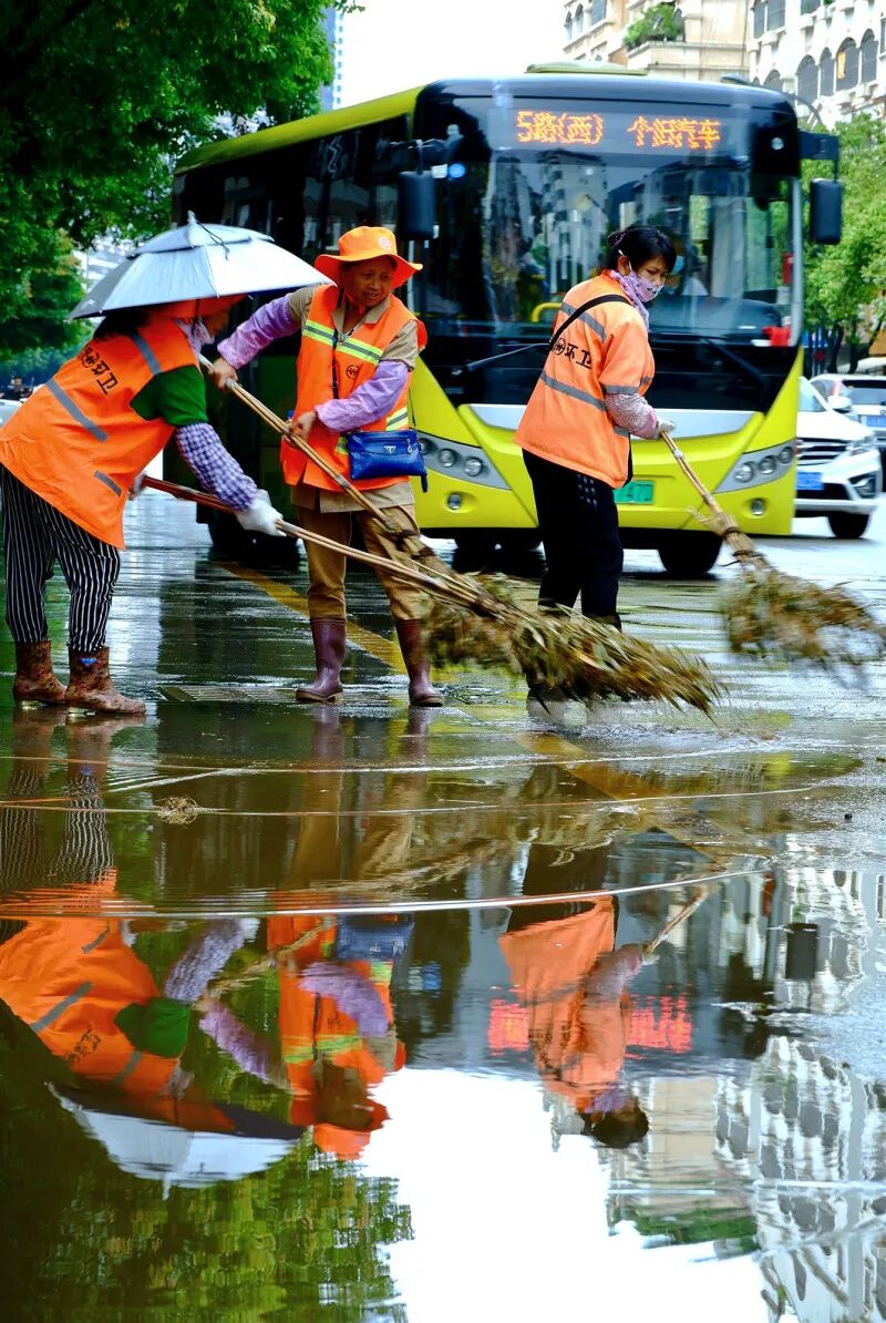 个旧环卫工人手持扫帚,在晨曦雨后开始一天的劳作。街巷因他们而整洁,城市因他们而苏醒。那一抹醒目的橙色,是日常中最动人的风景,守护着红河大地的清新容颜。