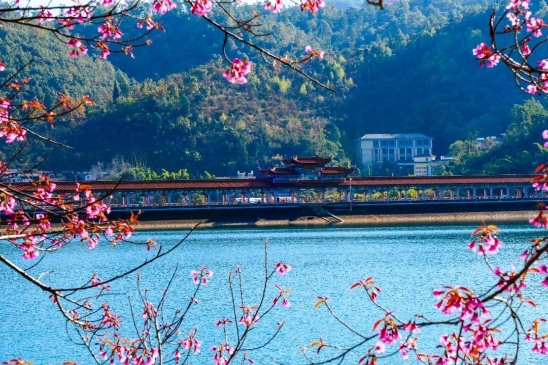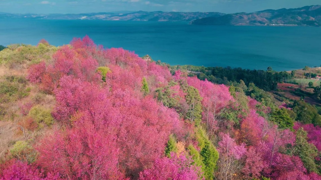 特点:冬樱花花期较长,花瓣柔软如绡,花色从淡粉至绯红渐变,与玉溪的湖光、山色、暖阳相映,形成独有的“暖冬花事”。
