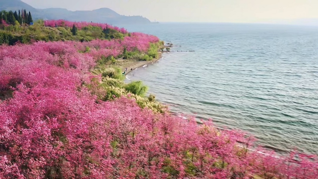 抚仙湖沿岸樱花分布较为开阔,花开时如一条粉色丝带环绕湖岸。湖水清澈见底,樱花倒影随波轻漾,形成“水下也开花”的奇妙景致。沿湖骑行或徒步,可一路欣赏花影、湖光与远山的层次交融。
