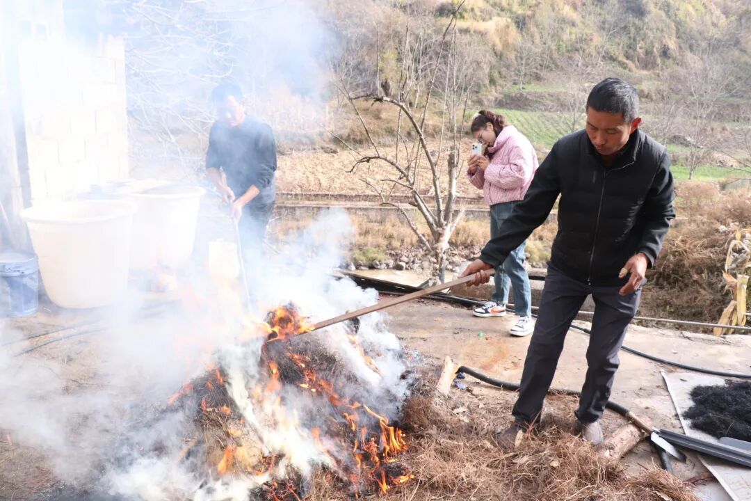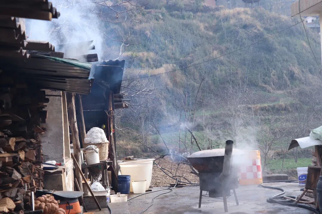 另一边,院子的角落早架起了大铁锅,焯水后的五花肉、排骨和猪血旺一同下锅,配上自家腌的老坛酸菜和干辣椒段,咕嘟咕嘟炖得满屋飘香。