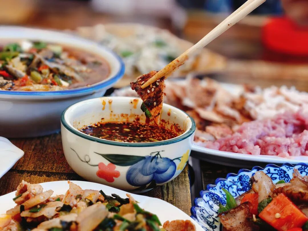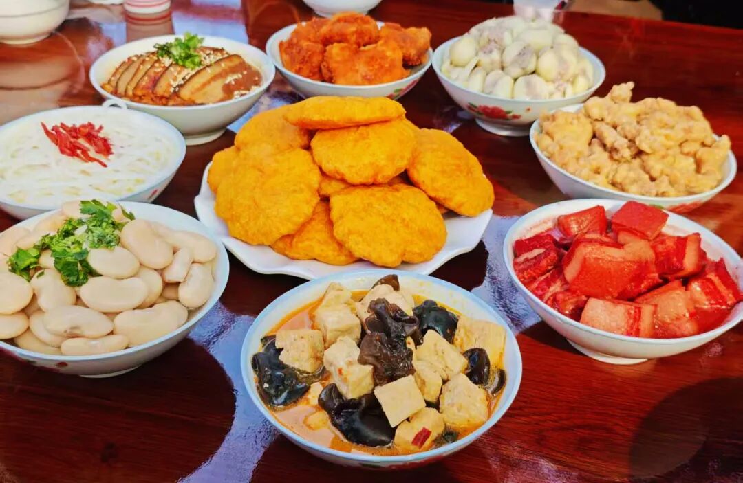 夕阳西下,院子里摆开了长桌宴。粉蒸肉软糯入味,梅菜扣肉油润不腻,排骨煮萝卜清甜解腻,生皮脆嫩爽口,猪血煮豆腐滑嫩鲜香,小炒肉麻辣够味,白芸豆煮火腿咸香……一碗碗丰盛的菜肴流水般摆上桌,亲戚朋友们围坐桌旁,推杯换盏,谈天说地。从日头高悬吃到月上树梢,菜凉了就回锅再热,汤喝光了就再炖,热闹劲儿半点没减。