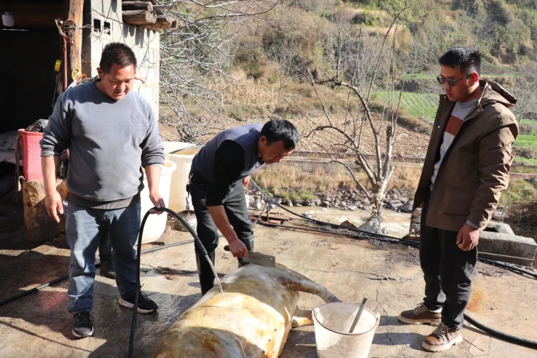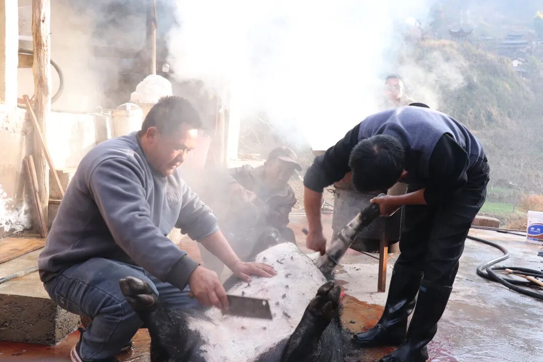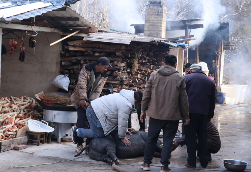 杀年猪当天,天还未亮,夜色还裹着寒意,主人家就已经早早起床,摸黑点燃灶膛里的柴火,烧好了一大锅滚烫的热水。冬日的暖阳刚爬上青瓦白墙,院子里就陆陆续续来人热闹起来。