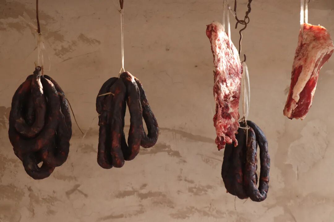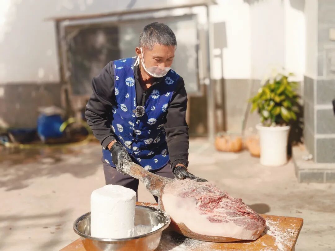 客人们围坐在一起喝酒划拳,声浪一波高过一波;主人家们挽着袖子,忙着处理剩下的肉——肥瘦相间的后腿肉切成条,抹上盐、花椒和秘制酱料仔细揉搓入味,一串串挂在屋檐下的晾杆上,是要做成油润咸香的腊肉。