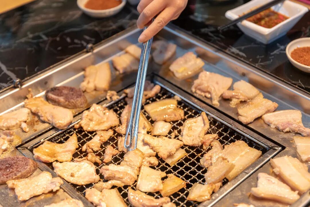 大块带皮五花肉在炭火上滋滋作响