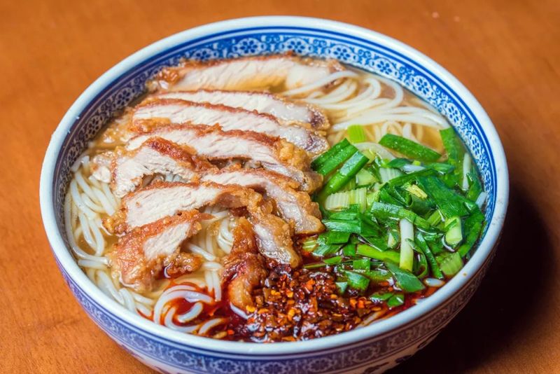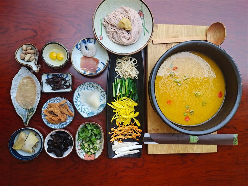 过桥米线制作技艺是国家级非物质文化遗产代表性项目,历史悠久。它的吃法也很有讲究,用的是堪比脸盆的海碗,装上滚烫的汤底,按照一旦(蛋)富贵、二如(肉)来运、三清(青)述(熟)道、四季(菊)花开、五福(腐)临门等口诀把配菜放入汤里,借助滚烫的汤底把配菜烫熟,这样不仅能够保证食材煮熟,也能最大程度保留食材的鲜美滋味。