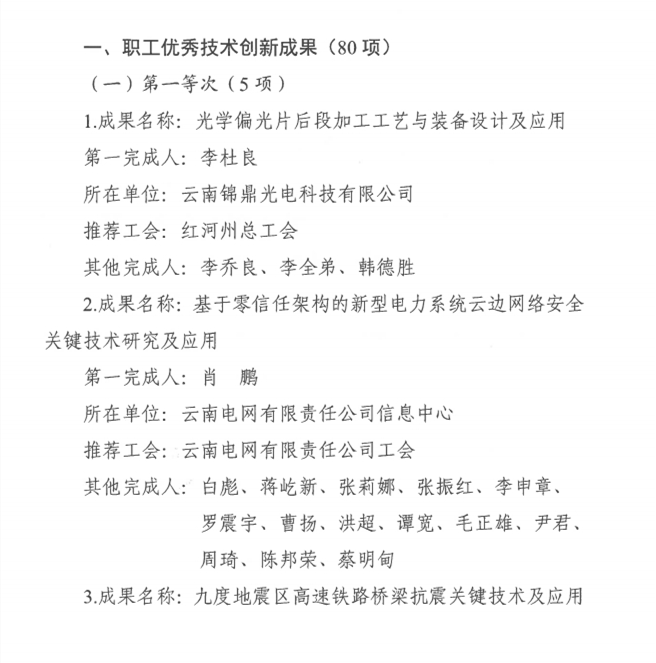 其中,红河州的云南锦鼎光电科技有限公司李杜良等4人,完成的“光学偏光片后段加工工艺与装备设计及应用”被评为职工优秀技术创新成果第一等次。