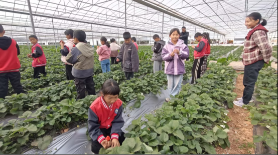 四年级师生及家长代表走进慕阳公司生态草莓园,开启农耕研学之旅。基地技术员详解草莓生长周期、科学种植方法及有机农业理念,孩子们亲手采摘果实,在亲近自然中领略农耕文化魅力,体会“一分耕耘,一分收获”的真谛。