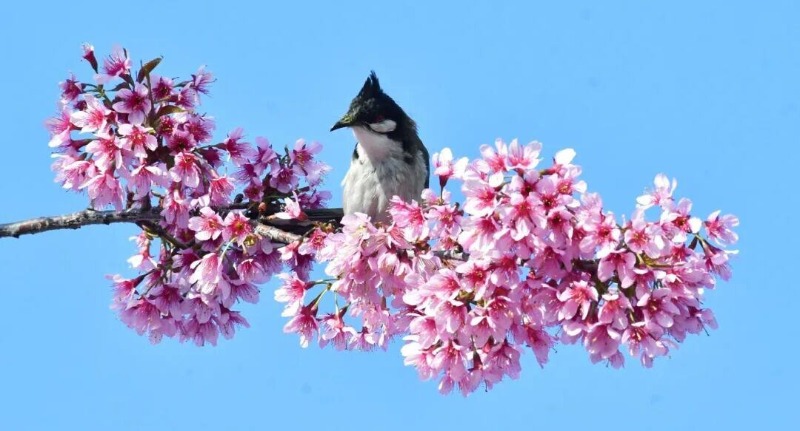 新年伊始,石屏异龙湖南岸的健身步道旁延绵三公里的冬樱花竞相绽放,朵朵粉花缀满枝头,绚烂如霞,绚丽的樱花不仅为冬日增添暖意,还吸引了灰腹绣眼鸟、红耳鹎、鹊鸲等鸟类前来。鸟儿们在花间嬉戏流连,构成一幅鸟语花香的生态画卷。(来源:云南日报-云新闻)