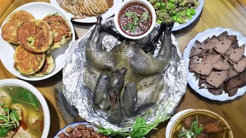 必吃的就是盐焖鸡!用黑井特有的煮盐卤水成沙,装入大锅成型后,用煮盐剩下的炭火烘干盐沙,再把鸡肉埋进盐沙里文火慢烤。烤好的鸡肉盐味适中,清香扑鼻,肉质鲜嫩不腻,还方便携带,吃一口就忘不掉!