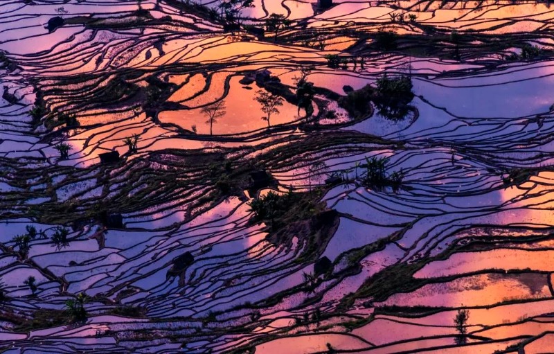 清晨六点,天还没亮,老张就已经站在元阳多依树梯田的观景台上,与身边的众多摄影爱好者一起,等待日出与云海在梯田上空交织的浪漫。随着时间缓缓流逝,晨雾如轻纱般在山谷间流转,第一缕阳光穿透云层,洒向层层叠叠的梯田水面。那一瞬间,千亩梯田仿佛被点亮——从淡蓝到金黄,从银白到绯红,光影在波光粼粼的水面上跳跃、流淌、变幻。用当地人的话来说就是“冬天的梯田最好看,水满田畴,像千万面镜子照着天空”。遍布哀牢山南麓的上万亩哈尼梯田,是哈尼族人用1300年时光谱写的大地诗行,这不仅是农耕文明的奇迹,更是光与影在冬日里谱写的交响诗。