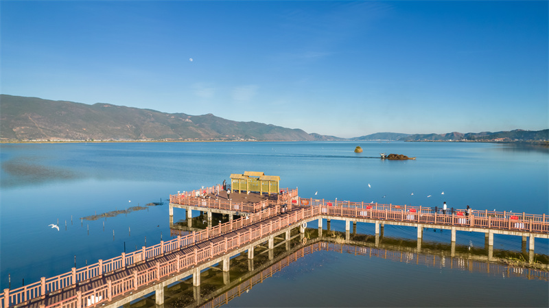 在异龙湖畔,老张深深被红河这份“没有冬天”的惊喜所震撼。他原以为冬季赏花是温室里的特权,直到看见异龙湖沿岸盛放的冬樱花。粉色的花朵如云似霞,倒映在碧蓝的湖面,几只白鹭掠过水面,惊起一圈圈涟漪。得益于红河独特的低纬高原气候,这里四季花开不败——冬日樱花开尽,春花便接续绽放,正是名副其实的“冬暖花开”。