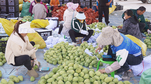 依托优越的气候资源优势,永兴乡自2019年引种凤梨释迦果以来,在村“党支部+合作社+农户”模式的引领下,产业实现了抱团发展。通过统一技术、标准和销售,种植面积从最初的70亩迅猛发展到1100亩,年产值预计突破700万元,成为群众增收致富的“金钥匙”。“这里的释迦果品质是附近品质相对较高的了,品质、口感、果型、甜度都是顶尖的。今天采收的这些大果可以收到19元一公斤,中果14元一公斤,小果8元一公斤;释迦果当天拉出去连夜就发往广东、天津、上海、海南。”收购商李建文告诉记者。