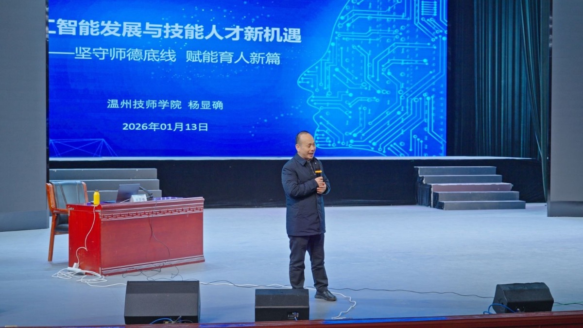 据悉,本次培训为期4天,温州技师学院专家团队将紧扣“人工智能赋能教学”主题,围绕AI技术在教学设计、课件优化、资源制作等方面的应用,采取集中讲授与机房实操相结合的方式开展系统培训,着力提升教师数字化教学能力。开班仪式结束后,温州技师学院党委委员、副校长杨显确以《人工智能发展与技能人才新机遇:坚守师德底线 赋能育人新篇》为题,为学员讲授第一课。