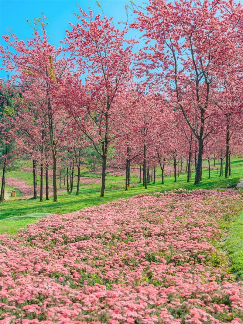 南华的德茂庄园里,百亩樱花林从沉睡中苏醒,漫山粉霞似天边流云,或热烈绽放,或含苞待放,娇嫩花瓣在阳光下闪烁着生命光泽。微风过处,落樱如雪纷飞,洒下满地温柔,让人沉醉在这诗意景致里。