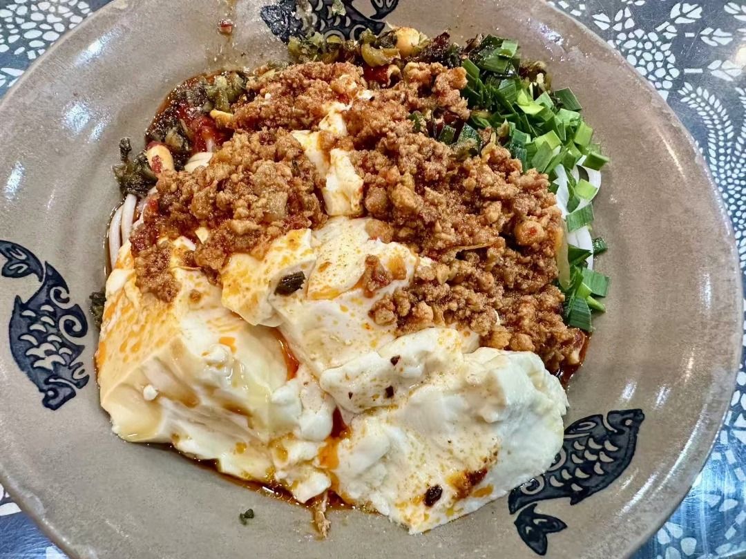 其次推荐玉春园的豆花米线。滑嫩雪白的豆花铺在爽口的米线上,淋上咸香带鲜的秘制酱汁,撒上酥脆的花生碎、爽口的韭菜和冬菜,再加上少许干辣椒提味,拌匀后每一口都裹着满满的料。豆花的绵密、米线的爽滑、花生的香脆在舌尖交织,咸香中带着一丝微辣,温润不刺激,吃完胃里暖暖的超舒服。