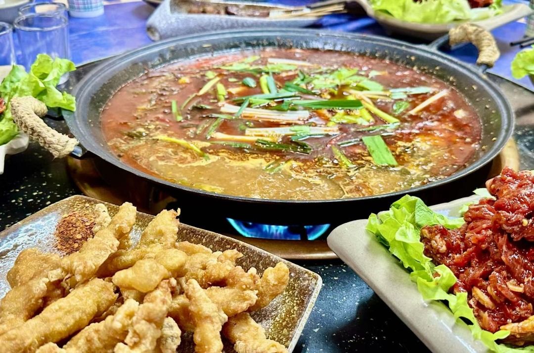 火锅首推酸菜牛肉火锅,发酵到位的酸菜酸爽开胃,鲜嫩的牛肉薄片在高汤里烫几秒即可出锅,牛肉吸饱酸香汤汁,这一口的鲜香酸辣只有尝过了才知道。天冷选炊锅准没错,荤素食材层层码在铜锅里,用高汤慢煮,咕嘟咕嘟冒着热气,食材吸满汤汁,暖乎乎的超治愈;爱吃鲜的别错过菌汤火锅,选用本地新鲜野生菌熬制汤底,鲜香醇厚,煮完食材还带着浓郁的山野气息。