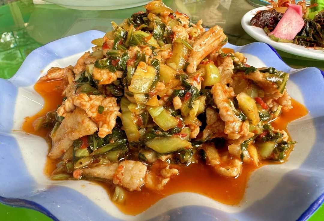 腌菜炒肉:用玉溪新平的酸腌菜,剁碎后和肉沫大火爆炒,腌菜的酸爽中和了肉沫的油脂,肉香十足,妥妥的下饭神器。