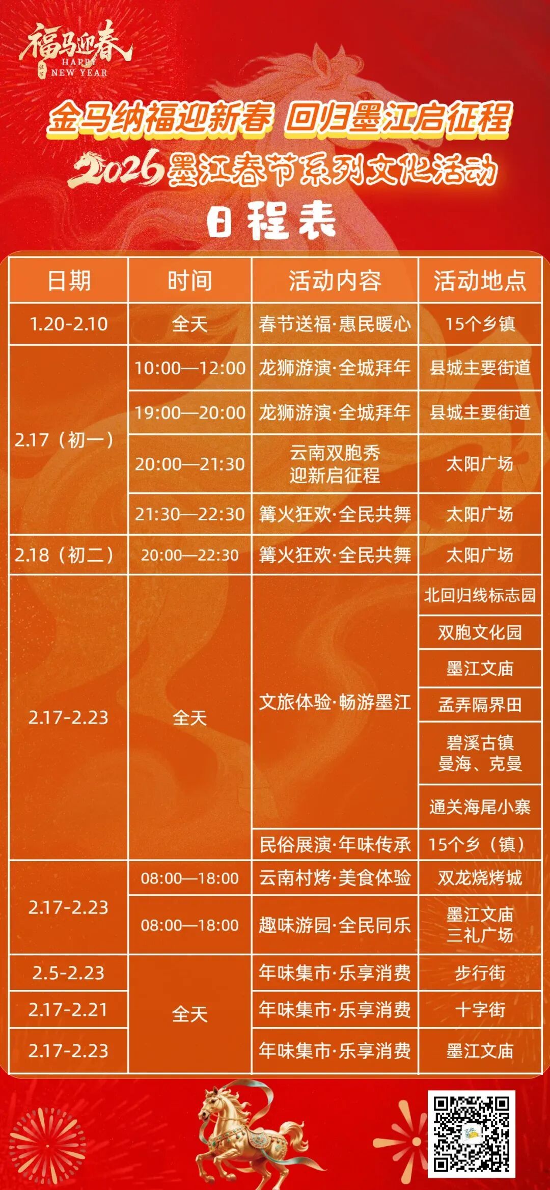 2026年春节,墨江以“金马纳福迎新春·回归墨江启征程”为主题,串联起从腊月到元宵的完整年节时光。全县15个乡镇联动,活动遍地开花——无论你偏爱民俗深度,还是热衷热闹体验,这里都已备好一整座城的诚意。