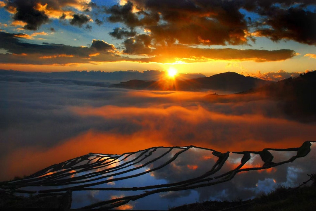 冬季是观赏云海最佳季节。元江那诺乡哈尼云海梯田是红河流域最古老的梯田,梯田随四季更迭换景,尤以冬春季节最为神奇壮美。当梯田与云海相会,奔腾的云海与错落有致的梯田相依相偎,一动一静间,变化万千,日出霞红之时,更加奇幻夺目。