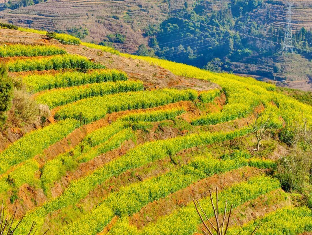 盛花期:1500亩盛开的油菜花铺展开来,汇聚成金色的海洋,花丛中忙着穿梭采撷的小蜜蜂,为冬日增添了几分灵动生机。一垄垄明艳的金黄随着山峦的起伏错落叠嶂,构成一幅立体的画卷。