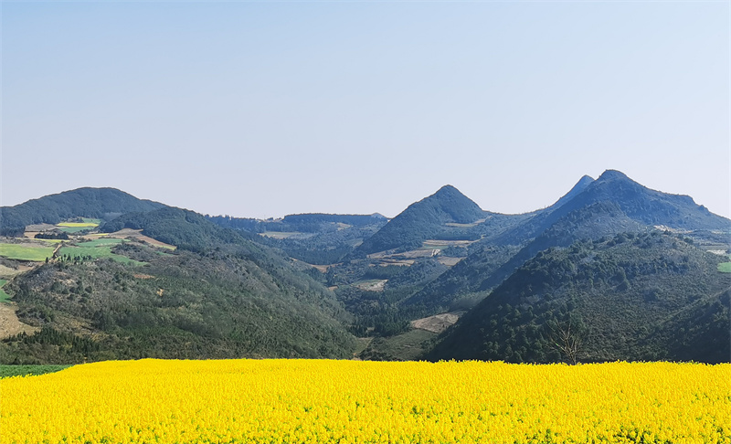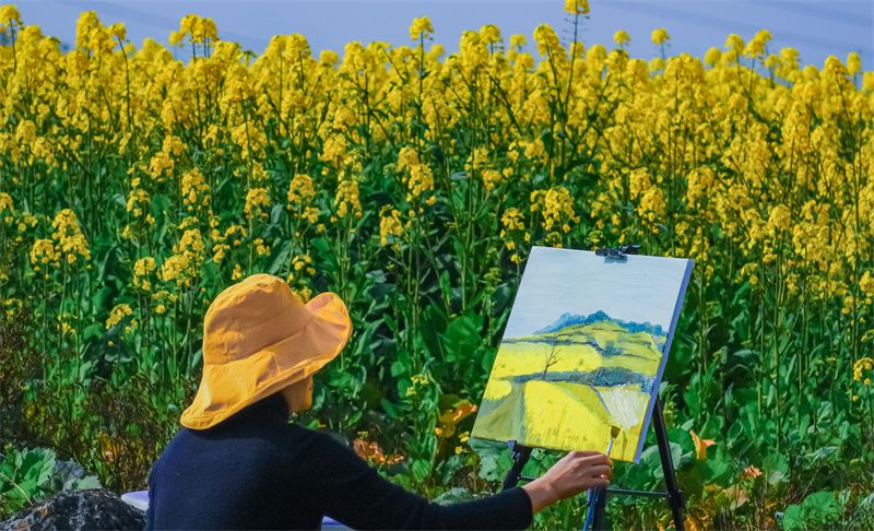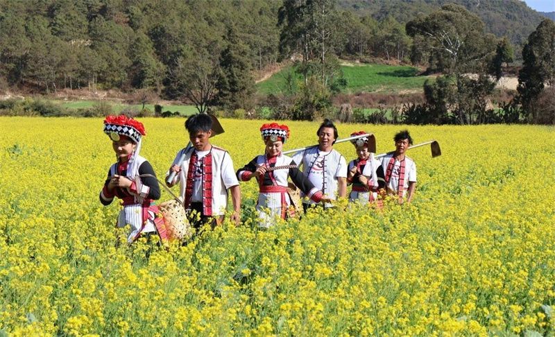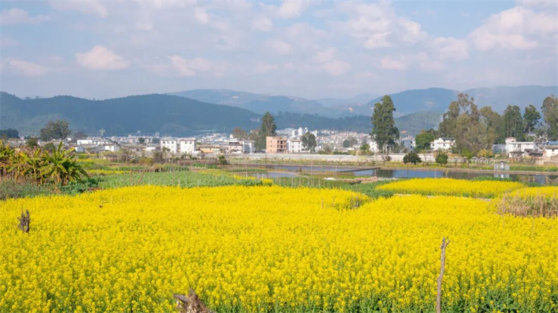 油菜花的金黄也在此时接棒登场,蒙自冷泉镇泥都底村的油菜花悄然把山野染成金色毯子。走进花海之中,沐浴在温暖的阳光下,专享整片鎏金花海。在弥勒西三镇戈西村委会小龙潭小组,满山的油菜花伴着微风轻轻摇曳,铺展出冬日里最耀眼的底色。在石屏宝秀镇,油菜花田肆意铺展分布在各村寨间,金灿灿的花海与错落有致的古民居相映成趣,这一抹冬日的金黄为小镇增添了别样的色彩。