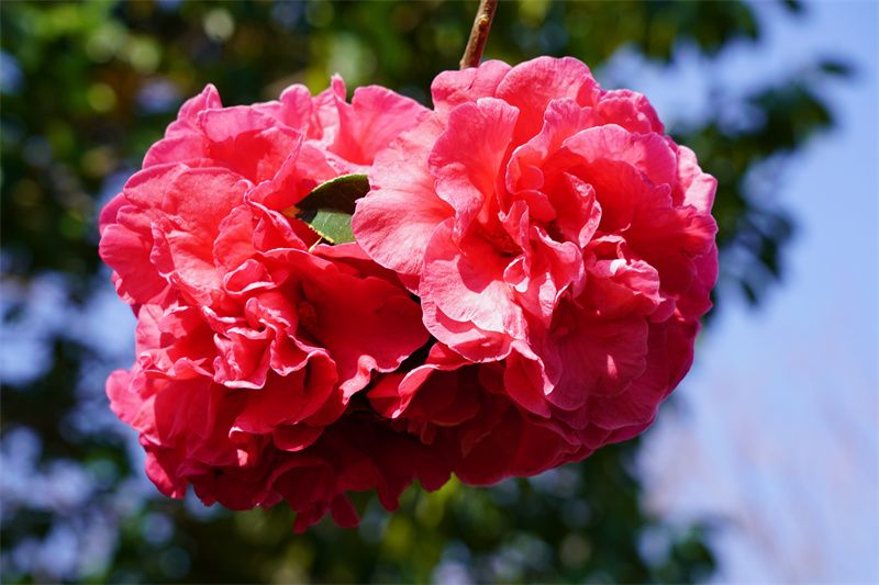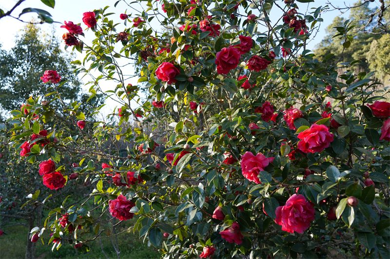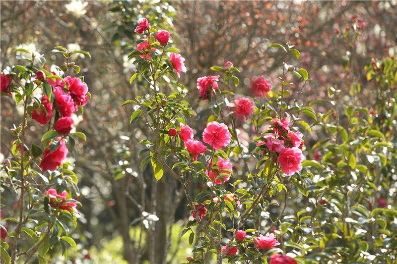 步入茶花园,一朵朵山茶花竞相开放,有的簇拥开放,有的傲立枝头,放眼望去一片片红彤彤、粉嘟嘟的山茶花格外惹眼。
