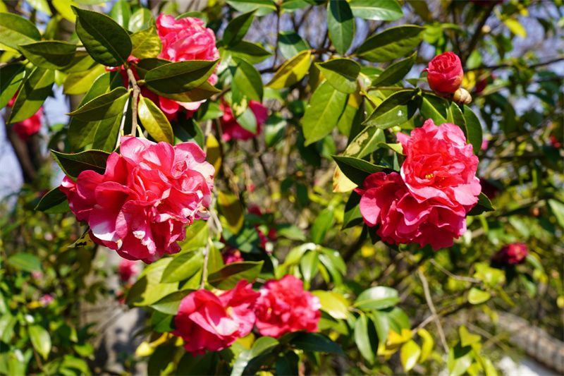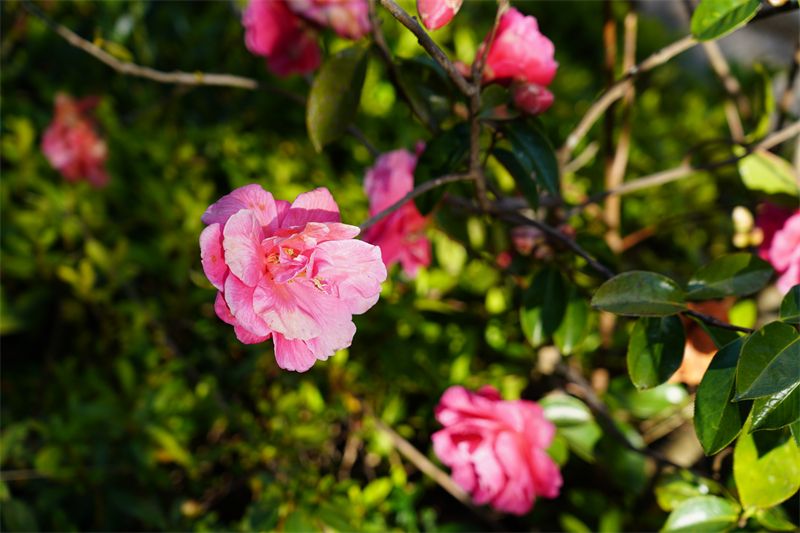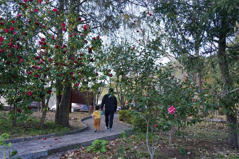 这里的山茶花品种繁多,相国茶的雍容、鹿城春的雅致、童子面的温婉、金花茶的珍稀,红的似火、粉的如霞、白的如玉,层层叠叠的花瓣裹着淡淡的清香,随风摇曳,沁人心脾。