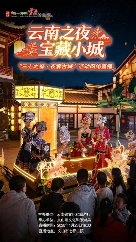 文旅头条讯(融媒体记者 缪欢 文)1月23日(周五)19:00,“云南之夜·宝藏小城”系列之 “三七之都·夜宴古城” 将在文山市七都古镇启幕,并通过多平台同步直播,带你云游滇东南,沉浸式体验古镇夜色与人文风情。