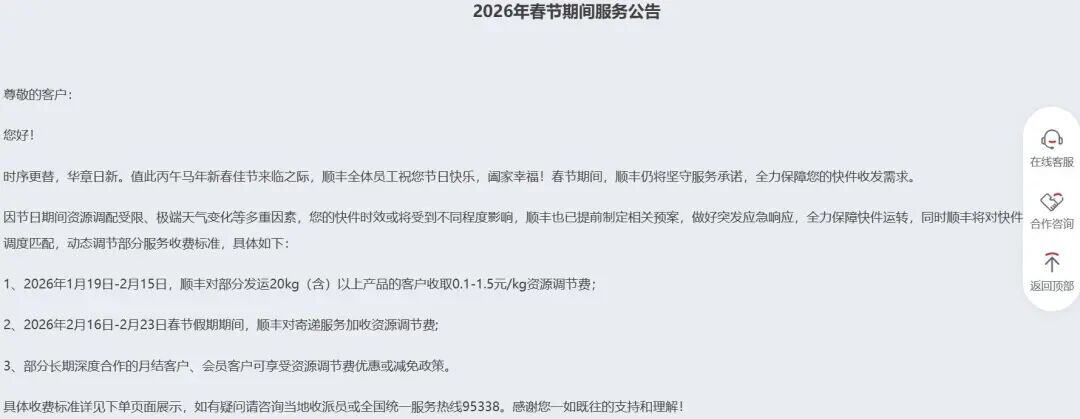 顺丰公告称,因节日期间资源调配受限、极端天气变化等多重因素,快件时效或将受到不同程度影响,将对快件和资源灵活调度匹配,动态调节部分服务收费标准。其中:2026年1月19日-2月15日,顺丰对部分发运20kg(含)以上产品的客户收取0.1-1.5元/kg资源调节费;2026年2月16日-2月23日春节假期期间,顺丰对寄递服务加收资源调节费。部分长期深度合作的月结客户、会员客户可享受资源调节费优惠或减免政策。
