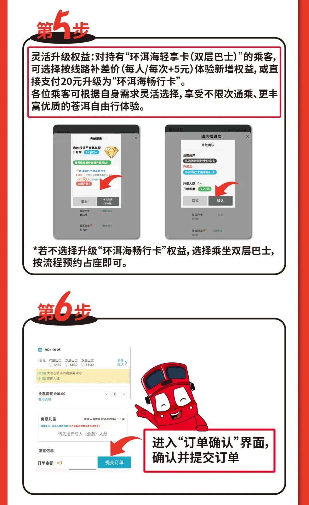 若想性价比、轻松环海,请选择【环洱海双层巴士】;若想获得包含巴士权益、舒适出行及完整的深度体验,可+20元选择升级为【苍洱自由行】服务。