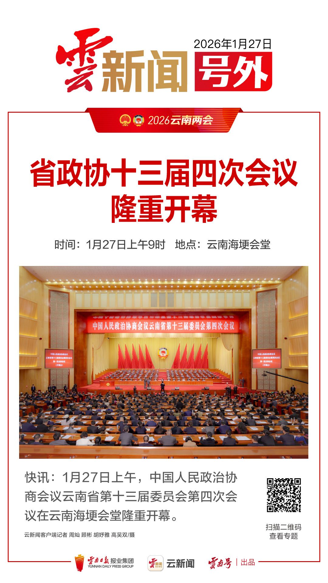 云新闻号外丨省政协十三届四次会议隆重开幕 2026-01-27 11:31 0 1月27日上午,中国人民政治协商会议云南省第十三届委员会第四次会议在昆明云南海埂会堂开幕。 来源 云南日报-云新闻 责编 李文明 校对 童文文 审核 李元