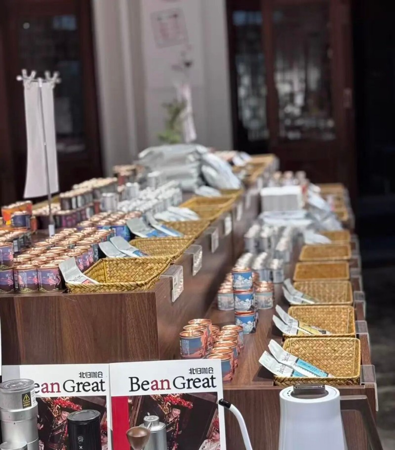 青石板院子充满诗意,架上摆满趣味手绘罐装豆——云南小粒、巴西坚果调、埃塞柑橘香……风味琳琅。店内设有咖啡展示与自助体验区,你可以自选豆子,亲手尝试手冲、拿铁或美式,感受做咖啡的乐趣。