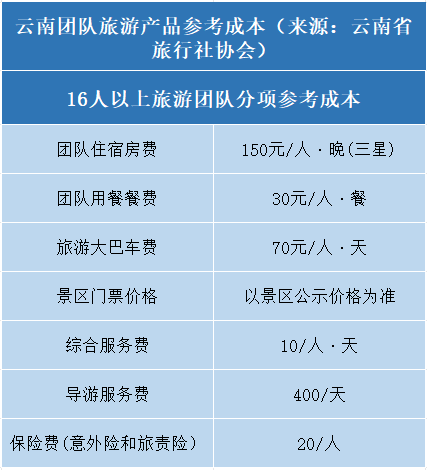 线路成本参考价/人=星级房价/人×入住天数+团队餐价/人×用餐次数+A级旅游景区门票价格/人+用车费/人×用车天数+综合服务费/人×出游天数+导游服务费/人×出游天数+保险费