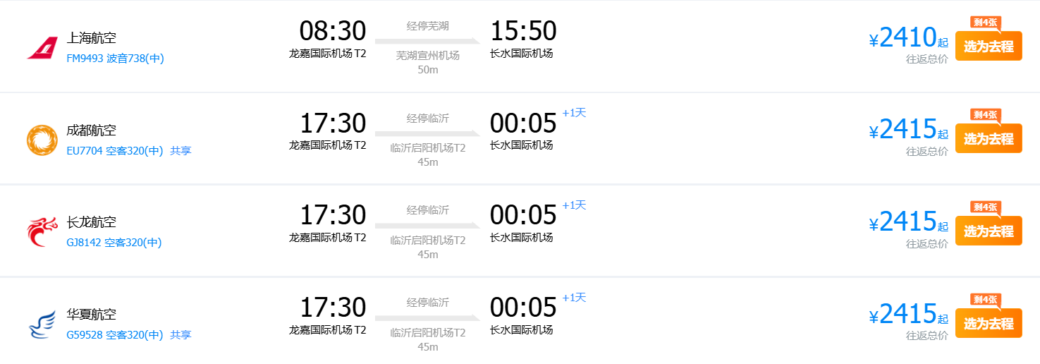 从行程看,从长春至昆明出发时查询的往返机票价格最低为2410元。