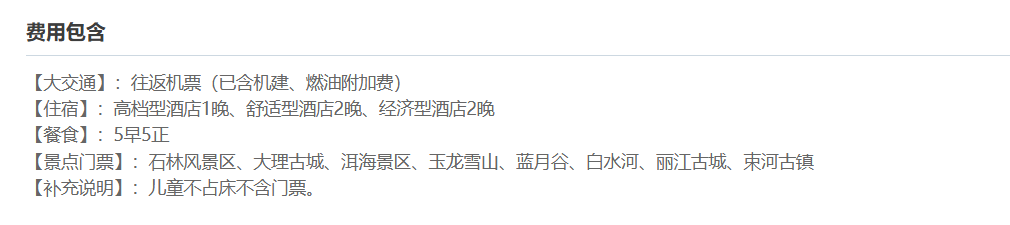 此行程包含往返机票、住宿、餐饮、景区门票、云南省内交通等费用