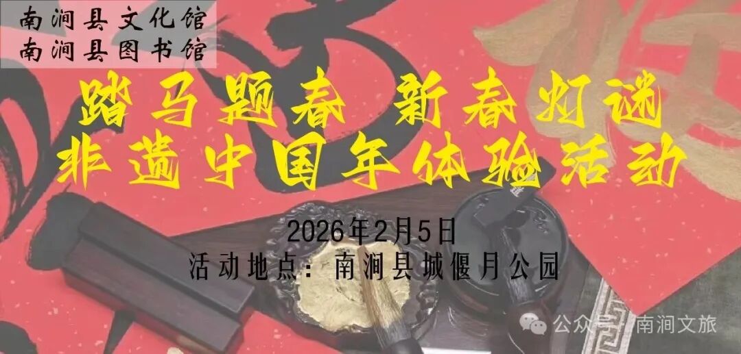 活动内容:注册成为“云南公共文化云”南涧文化馆平台用户、关注“南涧文旅”“南涧县文化馆”公众号、视频号,观看南涧县文化馆发布在云南公共文化云平台、“南涧文旅”“南涧县文化馆”公众号、视频号上的视频、资讯、线上展览等相关内容,便可免费获得“新春祝福”(对联一对、红包一套、福字一个)。每个新用户仅有一次领取机会,祝福仅200份,送完即止。