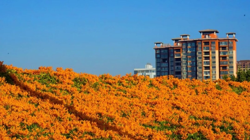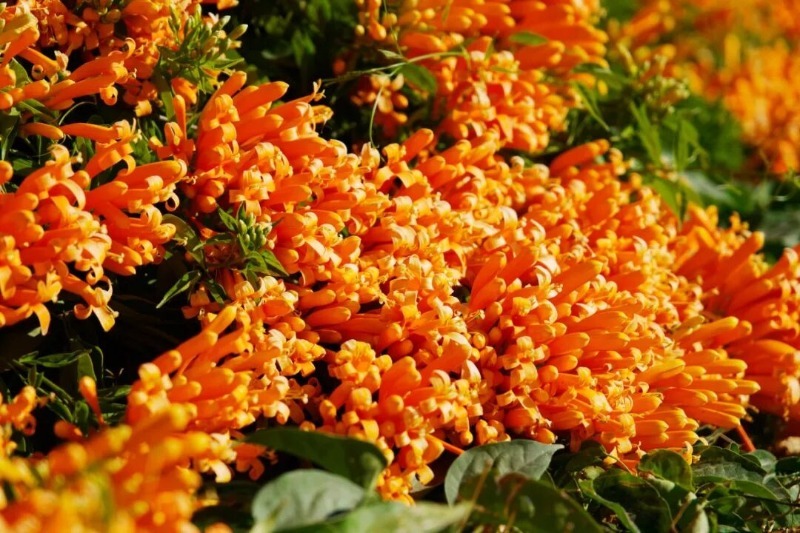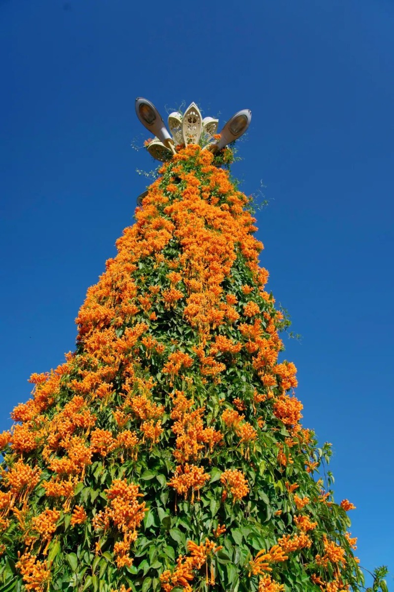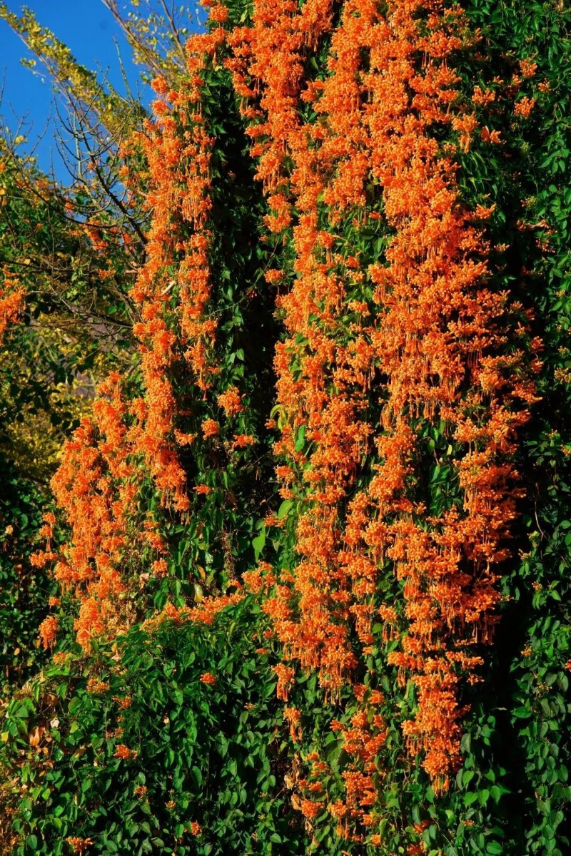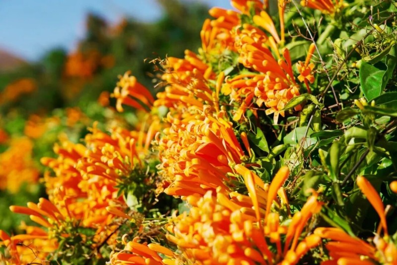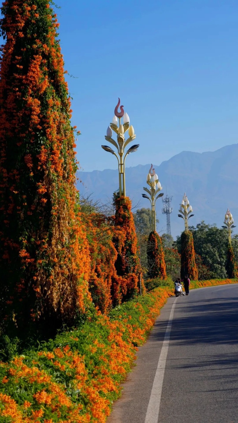 橙红花朵顺着藤蔓垂挂成帘,宛如串串点燃的鞭炮,将公路晕染成一片温暖烂漫的橙红海洋。