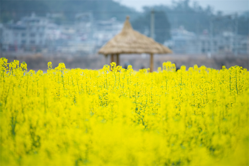 微风吹过,油菜花轻轻摇曳,在阳光照射下翻涌着金色波浪,静谧的乡村被金灿灿的花海装点一新。