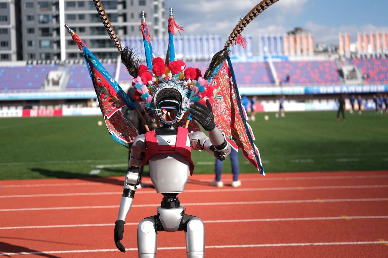 滇超联赛昆明主场开幕式上,伴随着滇剧锣鼓声,由机器人与机器狗组成的“科技天团”登场,领衔机器人身着滇剧戏服,机器狗披着彩色舞狮服装化身“赛博醒狮”,与学生及专业滇剧演员同台演绎特色节目。机器人精准完成滇剧经典手势,以及挥手、点头等动作,“赛博醒狮”同步摇头、摆尾、俯身配合,机械之躯与传统韵味巧妙融合,演员们的唱腔清亮婉转,锣鼓点敲得铿锵有力,和看台上的欢呼声此起彼伏,仿佛在进行一场跨时空的“对唱”。