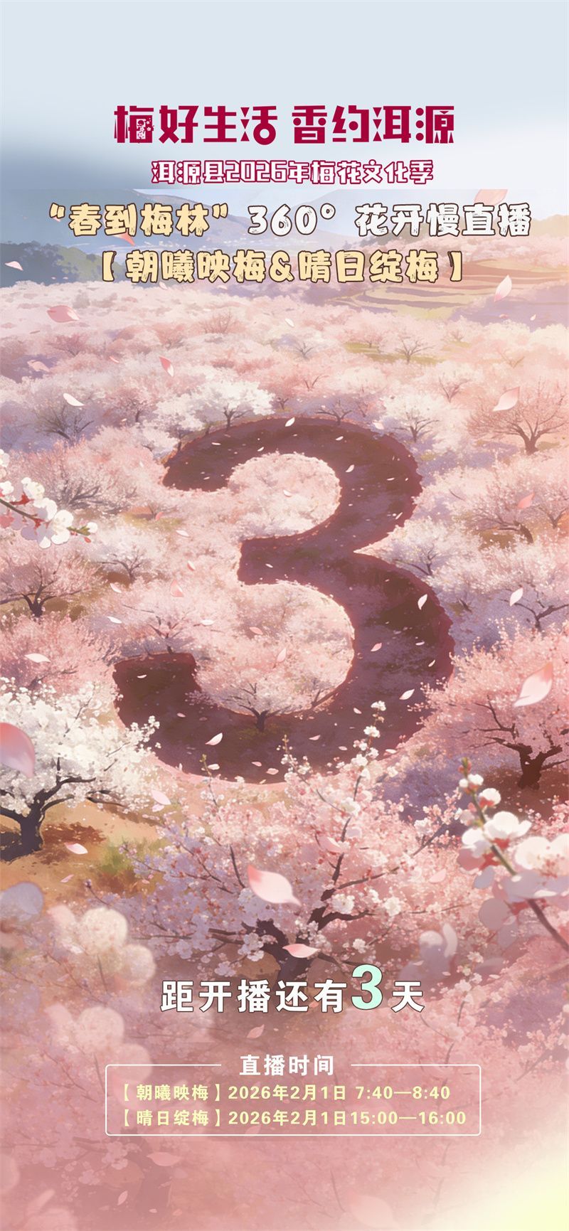 活动内容:通过云新闻客户端,采用聚合直播的方式,分朝曦映梅、晴日绽梅、落日映梅三个时段进行直播,画面以原生态为主,仅叠加极简字幕,实时标注梅花品种、花期进度与现场温度,搭配纯音乐,打造沉浸式陪伴感,带领全国观众“云上赏梅”。无论您身处何方,皆可在云端实时领略梅林花开的动态诗意。