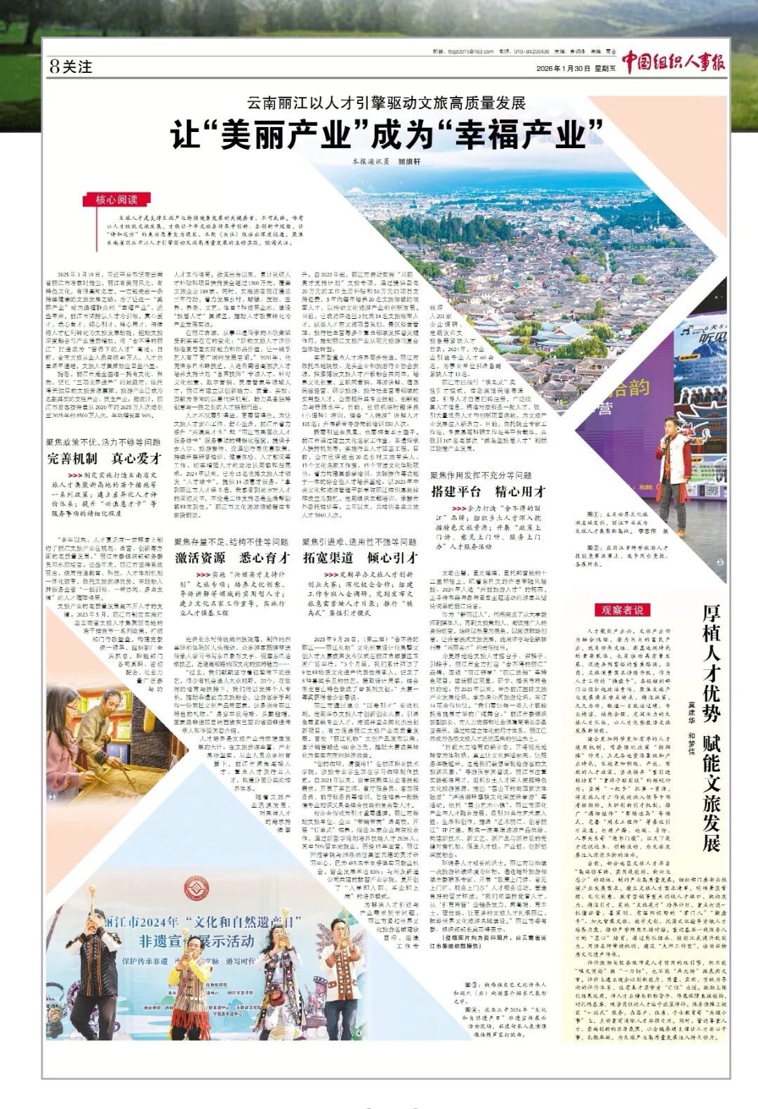 文旅人才是支撑文旅产业持续健康发展的关键要素,不可或缺。唯有以人才赋能文旅发展,才能让千年文脉在传承中创新、在创新中延续,让“诗和远方”的美好愿景变为现实。本期《关注》版推出深度报道,聚焦云南省丽江市以人才引擎驱动文旅高质量发展的生动实践,敬请关注。