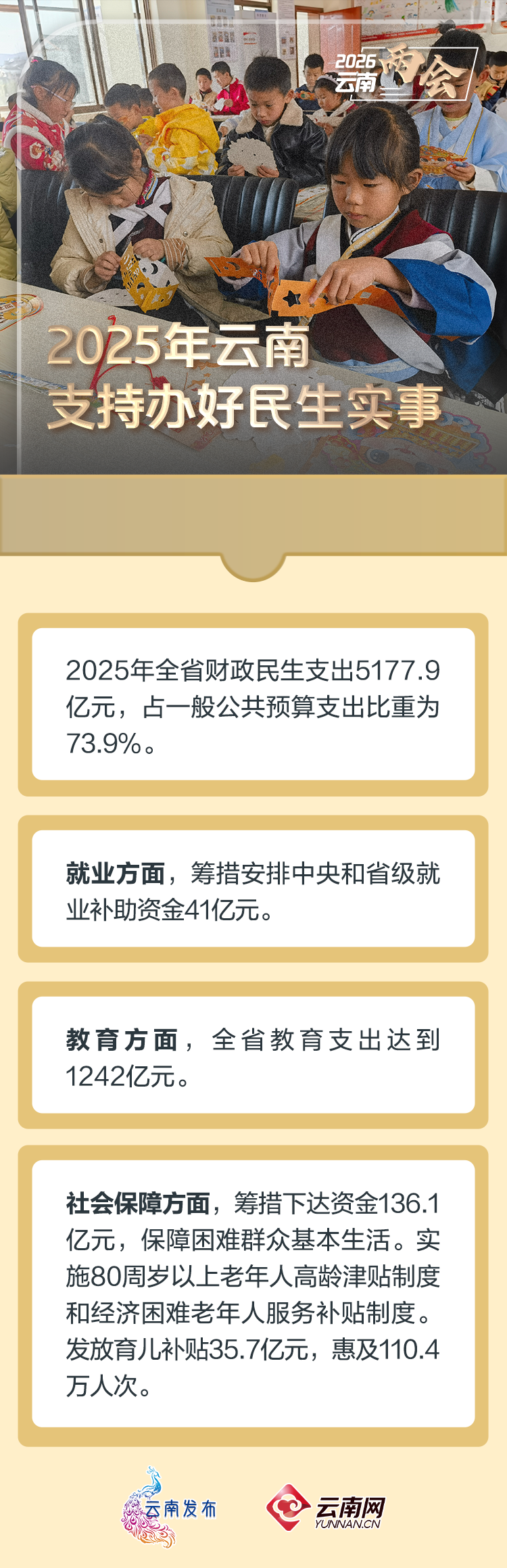 保持力度,夯实民生基础。2025年全省财政民生支出5177.9亿元,占一般公共预算支出比重为73.9%,支持办好民生实事。就业方面,筹措安排中央和省级就业补助资金41亿元,落实税费减免、就业补贴、稳岗返还等政策,拓宽市场化社会化就业渠道,支持重点群体就业创业。教育方面,全省教育支出达到1242亿元,其中持续安排20亿元基础教育综合奖补资金,推动义务教育优质均衡发展。社会保障方面,强化社保资金管理,增强社保基金统筹共济能力。筹措下达资金136.1亿元,保障困难群众基本生活。健全养老服务体系,实施80周岁以上老年人高龄津贴制度和经济困难老年人服务补贴制度。发放育儿补贴35.7亿元,惠及110.4万人次。防灾减灾救灾方面,支持地质灾害综合防治体系建设,建立应急救灾资金快速下达机制,保障人民群众生命财产安全。
